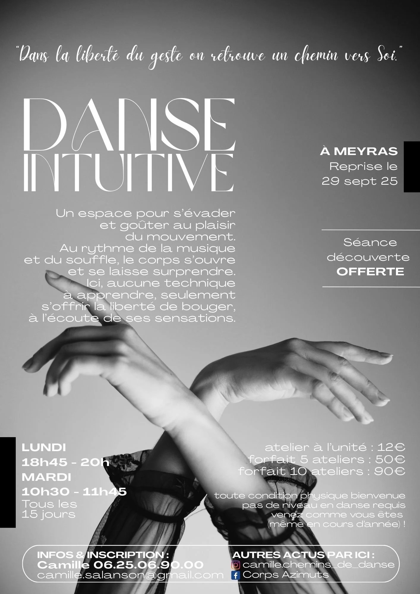 La danse intuitive est une pratique libre et spontanée, accessible à chacun.e, sans chorégraphie, sans pression, sans prérequis en danse.